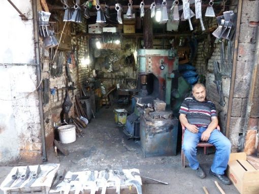 Bir demirci ustası plastik, solgun kırmızı bir sandalyeye oturmuş. Ellerini kasıklarının üzerine bırakmış. Kendini de koltuğa salıvermiş zaten. İlkel bir presleme aleti. Örs ve çekiçler. Duvarlarda iş aletleri. Tavana asılı olan yaptığı ürünler; çeşit çeşit kazmalar, keserler, satırlar… Tezgâh boş. Ara mı vermiş, iş mi yok? “Yaptıklarımı satamadım ki, yenilerini yapsam ne olacak?” der gibi. Gözler mi? Ahh o gözler! Sur’un gözleri gibi hüzünlü. Darbe yemiş. Öyle bir bakıyor ki, “Çek fotoğrafımı,” daha doğrusu “Halimi, İstanbullu, çek,” dercesine. Parmağım sızlıyor, cep telefonunun tuşuna basarken…