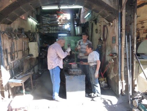 Bir kambur kalfa demiri tutuyor. Ayakkabıları boyundan büyük. Elinde iş eldivenleri. Boyu bir elliyi geçememiş. Onun tuttuğu kor demiri iki usta dövüyor. “Çevir!" diyor usta, kambur kalfa çeviriyor. Onlar da vuruşları kesişmeden tokmak darbelerini indiriyorlar kor durumundaki demirin üstüne. Ne şekil alacaksa? Hangi noktada uslanacak demir acaba? Ne olunca “Yeter!” diye bağıracak, “Yeter dövdüğünüz!” Arka tarafta dördüncü kişi bileme işi yapıyor. Ateş huzmeleri çıkıyor bileme aletinden. Gözlüksüz çalışıyor. Taş zımparanın sesi kulaklarımın pasını da zımparalıyor sanki.