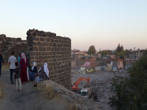 Fotoğrafta dört kadın var. Türbanlı değiller, başörtülüler. İkisi ayakta duruyor. İki çocuk ve bir genç var yanlarında. Kadınlar surların yıkılmış bir burcunun dibine oturmuşlar, Sur’a bakıyorlar. Aşağıda bir iş makinesi çalışıyor. Bir kamyona molozları yüklüyor. Anılarla birlikte. Tarihle birlikte. Tarih, anılar, yaşananlar, izler, fısıltılar, hepsi biraz sonra ait oldukları mekâna veda edecekler. Geri dönmemecesine. Bazı evler tamamen yıkılmış. Bazılarının dış duvarları… İç duvarlar pembeli, yeşilli, mavili çıkmışlar ortaya. Bazı evler sıralarını bekliyor…